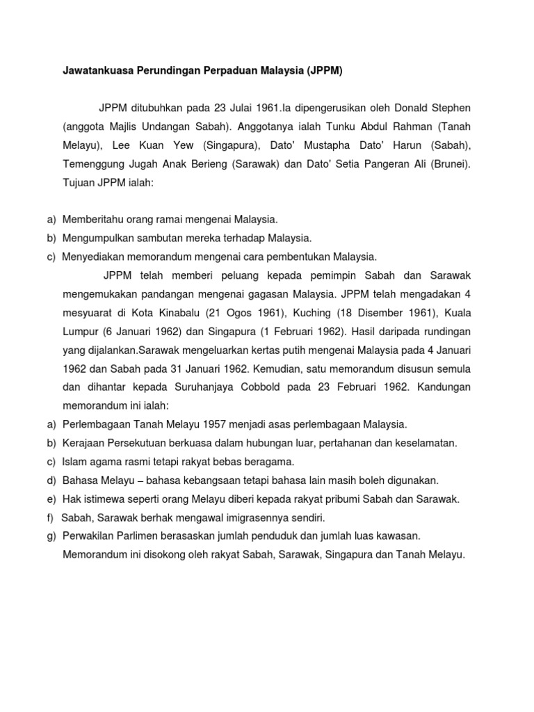 Pada 23 julai 1961, jawatankuasa perundingan perpaduan malaysia (jppm) ditubuhkan. Membentuk satu perlembagaan berdasarkan perlembagaan persekutuan tanah melayu 1957, laporan suruhanjaya cobbold dan jawatankuasa perundingan perpaduan malaysia. Proses perbincangan dan perundingan kearah pembentukan malaysia ini sebenarnya sangat panjang dan kompleks. 1 ) jawatankuasa perundingan perpaduan malaysia (jppm) (23 julai 1961 ). Jppm ditubuhkan pada 23 julai 1961.ia dipengerusikan oleh donald stephen (anggota majlis undangan sabah).