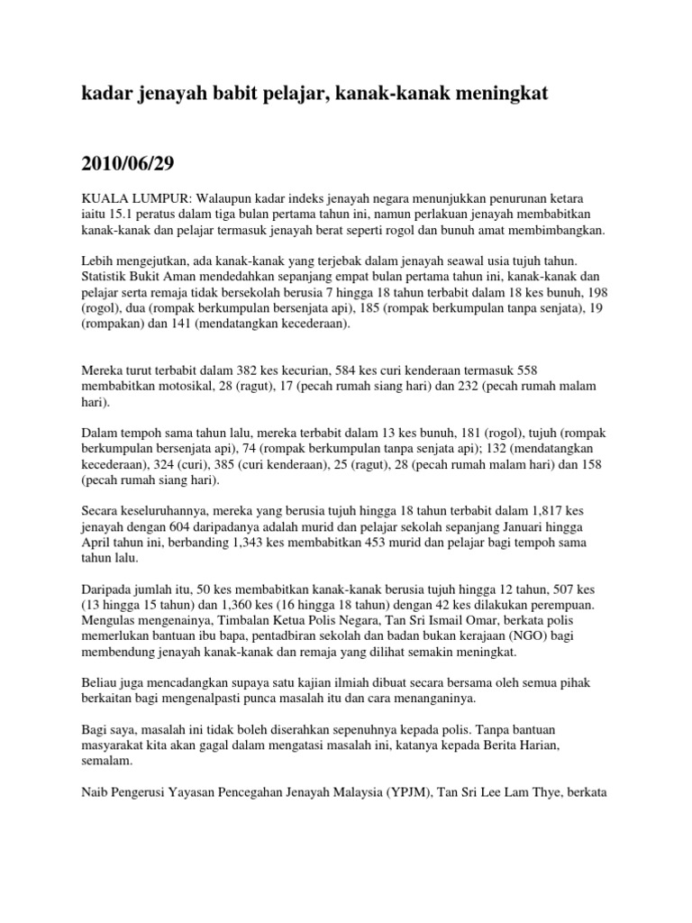 Jenayah di malaysia mencatatkan peningkatan dari tahun ke tahun, jenayah utama adalah kecurian. What does kadar jenayah mean in malay? Malaysia disenaraikan sebagai negara yang mempunyai kadar jenayah tertinggi di asia tenggara. Tp masih ramai yg mandi manda di kawasan lubuk belukar bukit. The crime rate in our country are at critical levels.