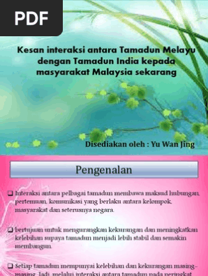 Interaksi antara tamadun islam dengan tmdun melayu. Wujudnya interaksi ini adalah disebabkan semangat toleransi dan sikap saling hormat menghormati yang ditunjukkan antara tamadun dengan tamadun lain. Interkasi antara tamadunmaksud maksud contoh contoh faktor faktor interaksi interaksi antara antara tamadun tamadun agama, pegangan nilai, bahasa, budaya, adat dan sistem sosial mempengaruhi interaksi pelbagai tamadun faktor interaksi faktor interaksi. 3 pendahuluan setiap tamadun manusia yang wujud di dunia ini dari dahulu hingga sekarang saling berinteraksi antara satu sama lain. Interaksi antara tamadun china dengan tamadun melayu melibatkan kemahiran dan teknologi serta kebendaan.